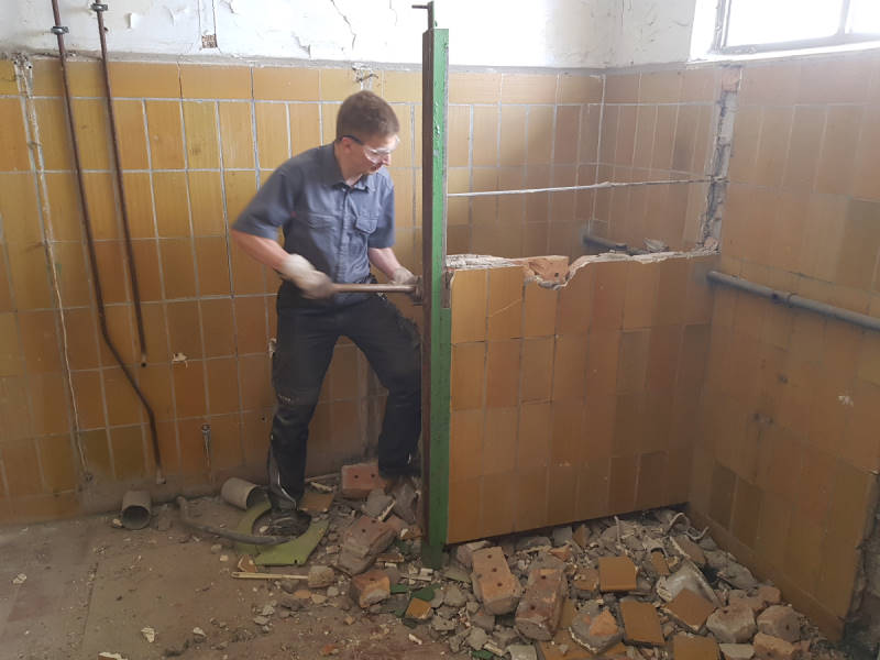 Am vergangenen Samstag wurde gleich an mehreren Projekten gleichzeitig gearbeitet. Beginnen wir mit den Arbeiten in der ehemaligen Toilettenanlage, die von außen an die Rückseite des Lokschuppen angebaut ist: Da eine Wieder-Inbetriebnahme für die Öffentlichkeit aufgrund fehlender Zu- und Abflüsse und schlechter Zuwegung ausgeschlossen war, haben wir beschlossen, die Räumlichkeiten zu entkernen und als Lager für Kleinteile umzubauen. Das ist mittelfristig sinnvoll, denn überall stehen Kisten und Kästen mit Schrauben, Muttern, Splinten und Dichtungen herum, die nun hoffentlich bald einen geordneten Platz finden.