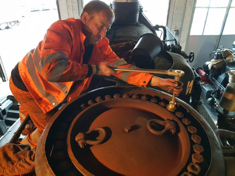 Oben auf dem Kessel befindet sich der Dampfdom, in dem sich der Dampfregler befindet. Das ist ein großes Ventil, das der Lokführer vom Führerstand öffnen kann, um Dampf vom Kessel in die Antriebszylinder zu geben. Dieser Regler wurde zur Aufarbeitung ausgebaut. Um die im Rahmen der Kesseluntersuchung notwendige Druckprobe durchführen zu können, wurde die entstanden Öffnung und der Dampfdom selbst verschlossen.