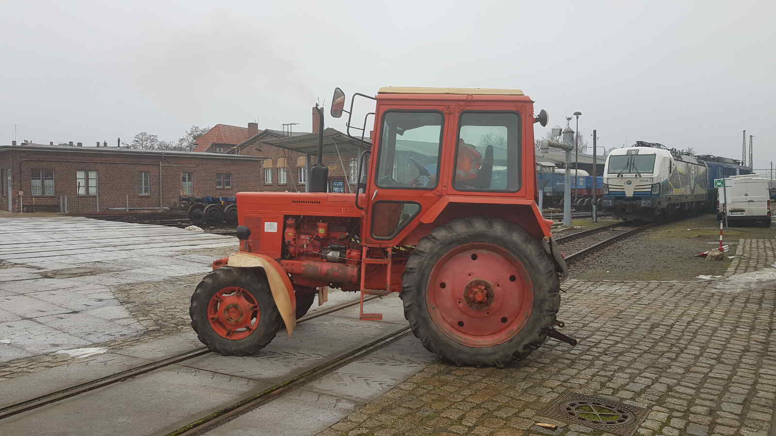 Die notwendigen Rangierarbeiten hierfür wurden durch einen Traktor Mts 572 aus sowjetischer Produktion. Er wurde 1990 in Minsk hergestellt und sein Motor leistet ca. 60 PS. Freundlicherweise hat ihn ein Vereinskollege in Wittenberge für unsere internen Transporte stationiert.